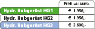 • Hydr. Hubgerüst HG1 mit Dreipunkt-Geräteaufnahme (Schnellkuppler) • Hydr. Hubgerüst HG2 mit spezieller unterer Aufnahme für Zubehör Transportgabel TG1 • Hydr. Hubgerüst HG3 mit fix aufgebauter hydr. Transportgabel TG-H